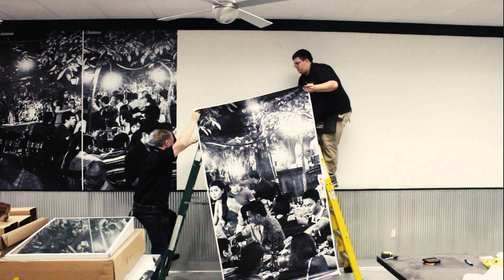A few more tips to keep in mind: Dampen the paper with the adhesive, do not soak or saturate it. Don’t fold the mural paper. Make sure the wall is clean and grease-free. Overlap each panel slightly to prevent the seams from showing when dry.